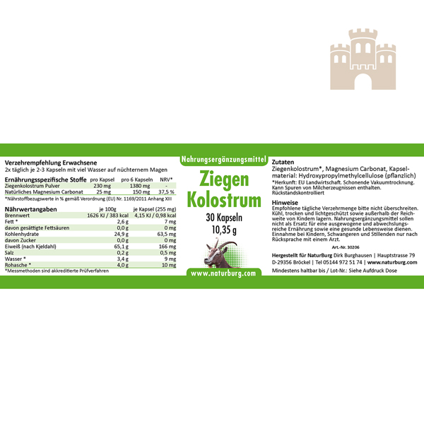 Packungsinhalt: 30 Kapseln (rein pflanzlich) Ziegencolostrum a` 345 mg, Netto Gewicht 10,35 g e